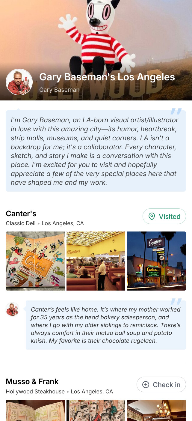 I'm Gary Baseman, an LA-born visual artist/illustrator in love with this amazing city—its humor, heartbreak, strip malls, museums, and quiet corners. LA isn't a backdrop for me; it's a collaborator. Every character, sketch, and story I make is a conversation with this place. I'm excited for you to visit and hopefully appreciate a few of the very special places here that have shaped me and my work.