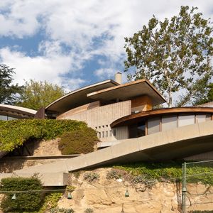 Crowning a Silver Lake hilltop with sweeping concrete curves and a cantilevered carport that arcs over the driveway like a wing, Silvertop is Lautner's most commanding residential gesture. Originally built for Kenneth Reiner, it features a rooftop pool, retractable glass walls, and panoramic views. Lautner considered it one of his most complete works. Visible from numerous points around Silver Lake — drive slowly on Micheltorena.