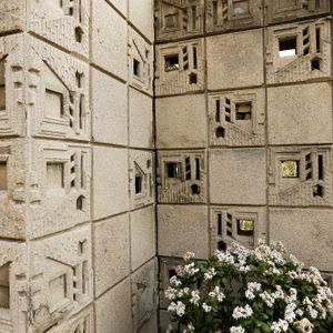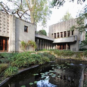 The smallest and most experimental of Wright's textile block houses, designed for dance enthusiasts Samuel and Harriet Freeman. Its perforated block pattern creates a lace-like screen wall that dissolves the boundary between inside and out. The house became a salon for LA's artistic community — Schindler, Neutra, Edward Weston all passed through. Now owned by USC, it remains structurally fragile and mostly closed, but the facade is stunning from Glencoe Way.