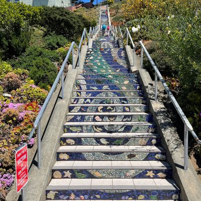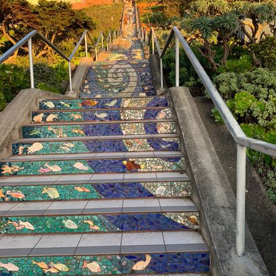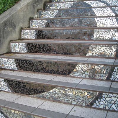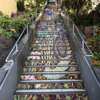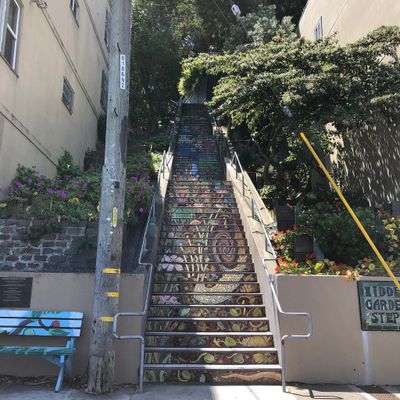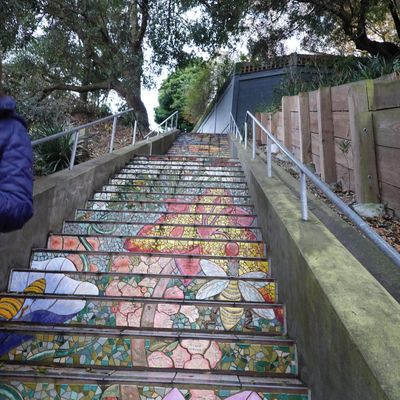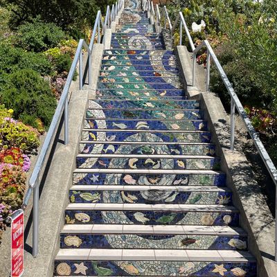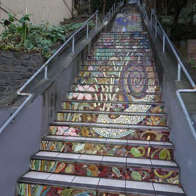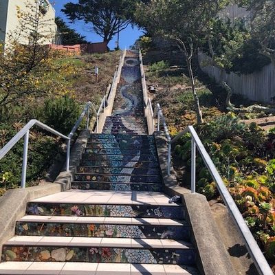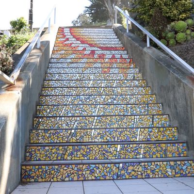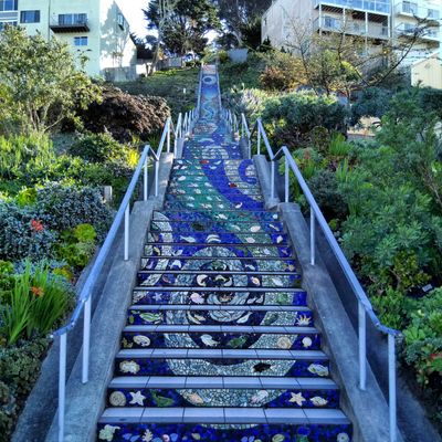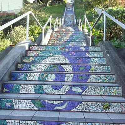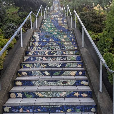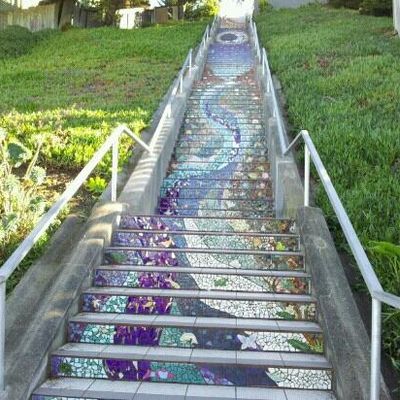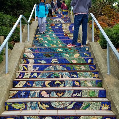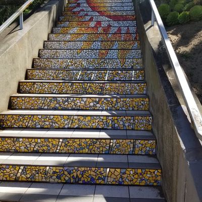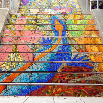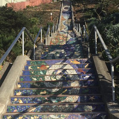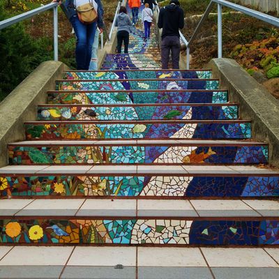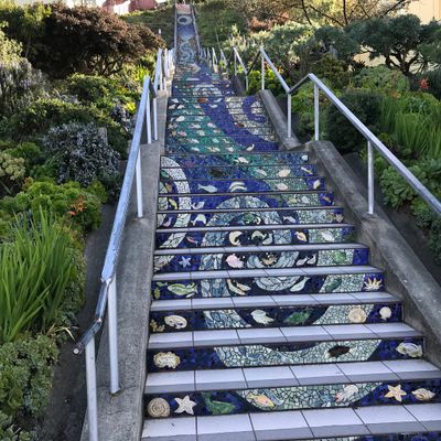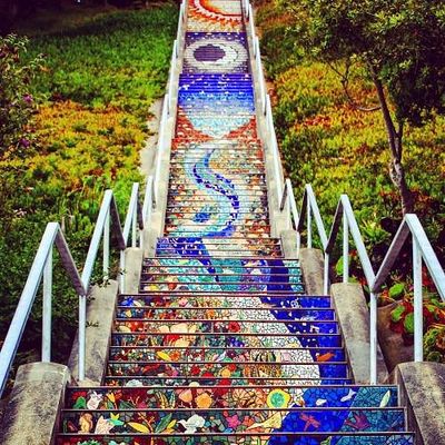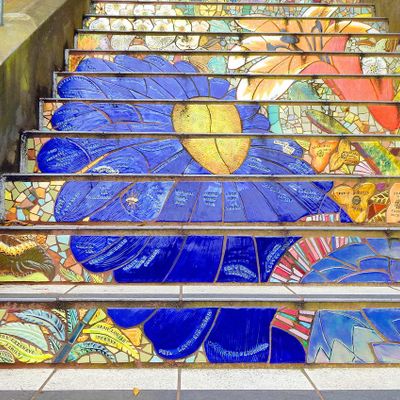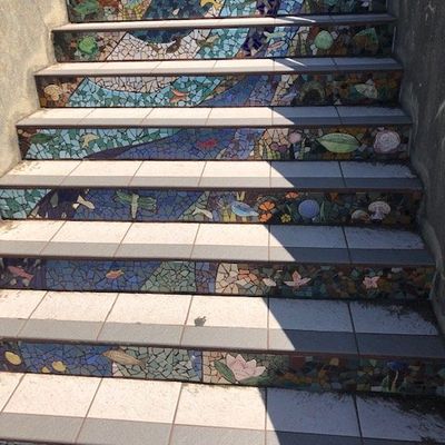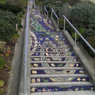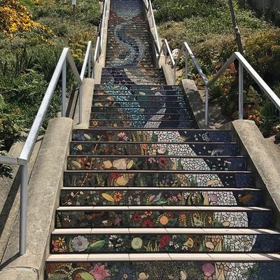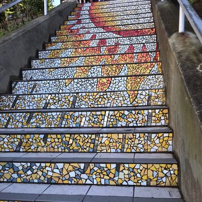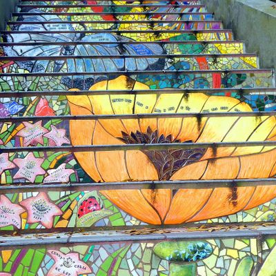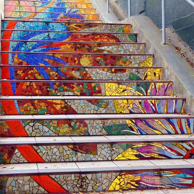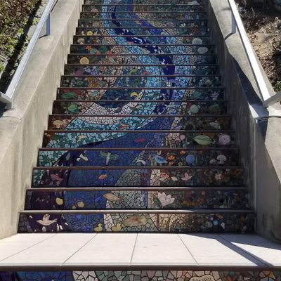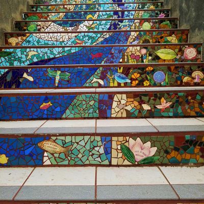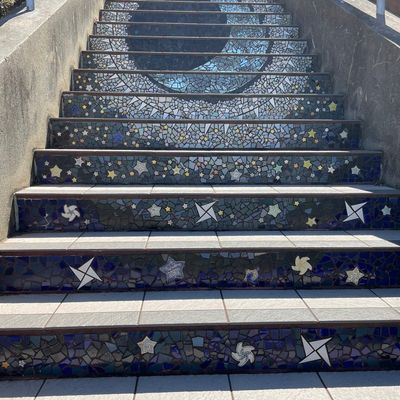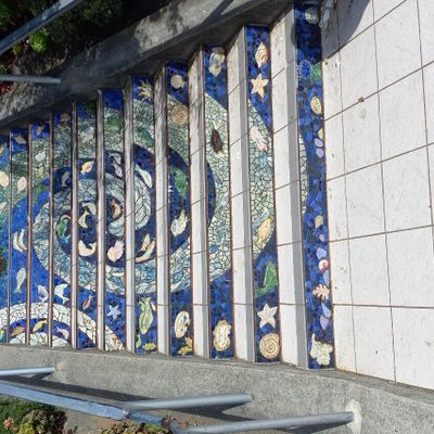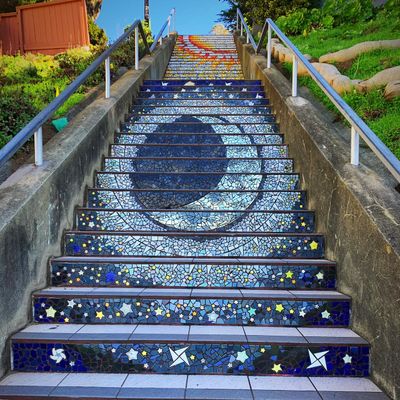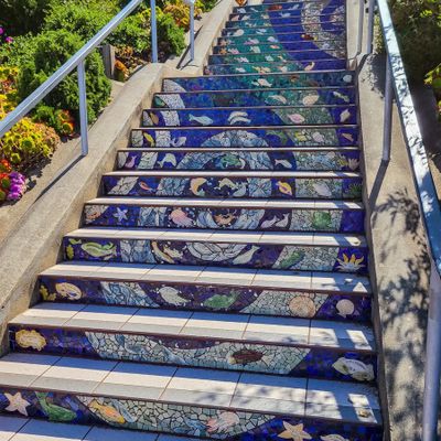Public art installation featuring a 163-step stairway adorned with intricate mosaic tiles. This neighborhood collaboration showcases a sea-to-stars theme with vibrant details and surrounding gardens.