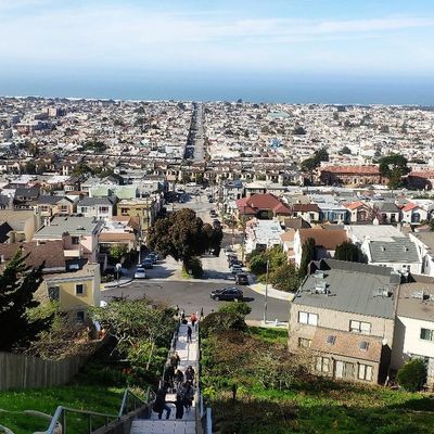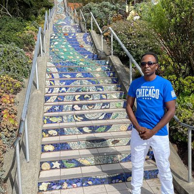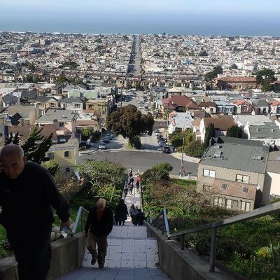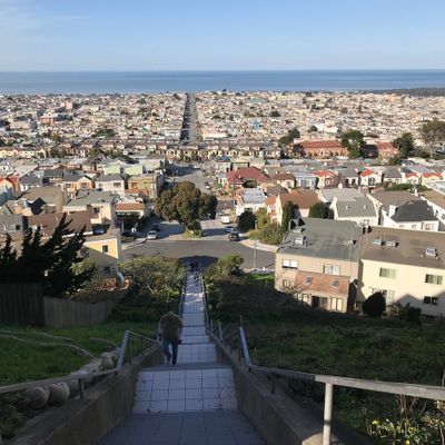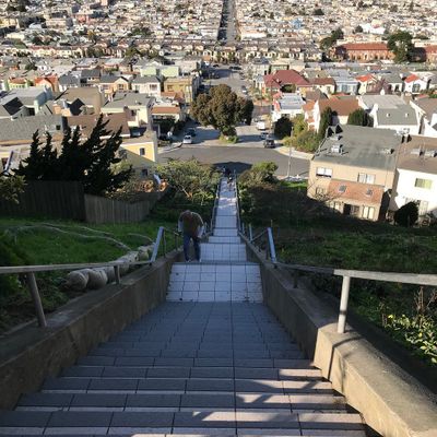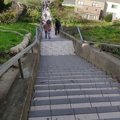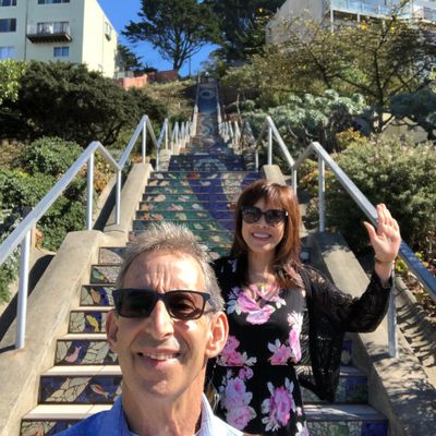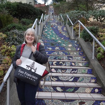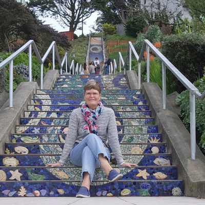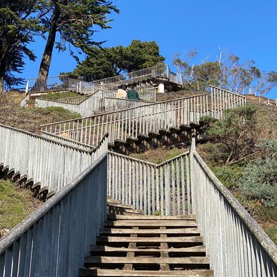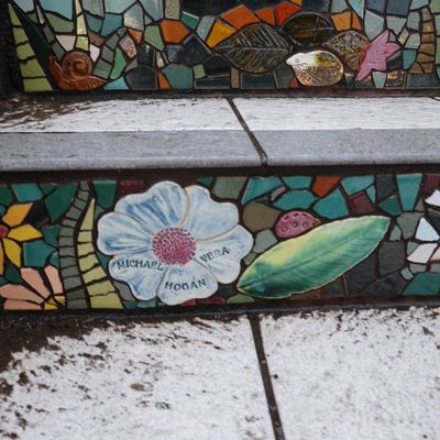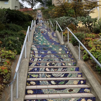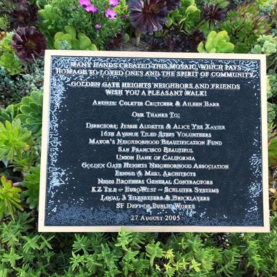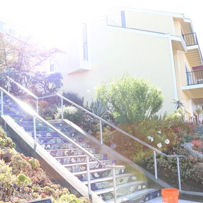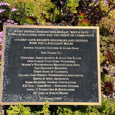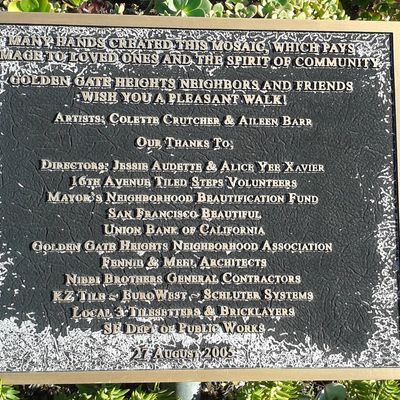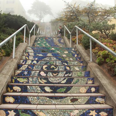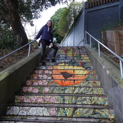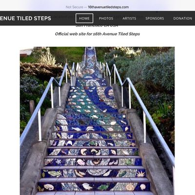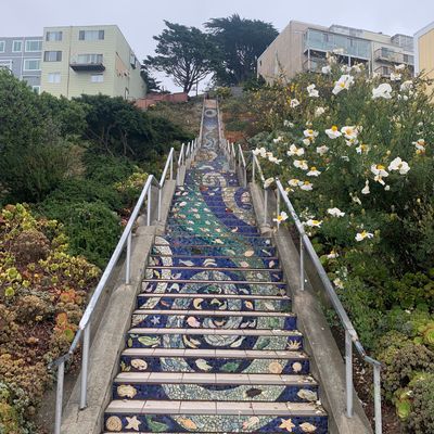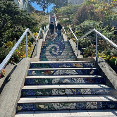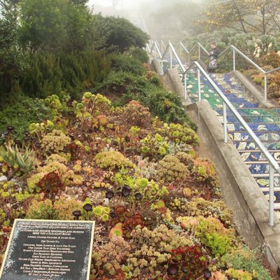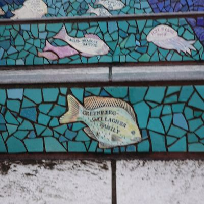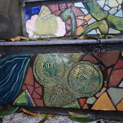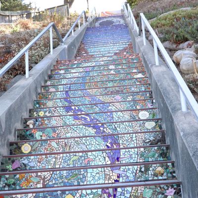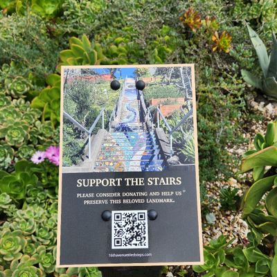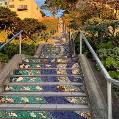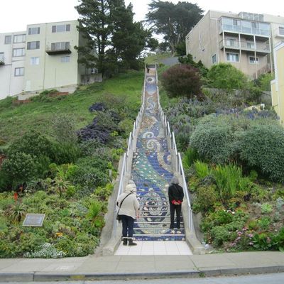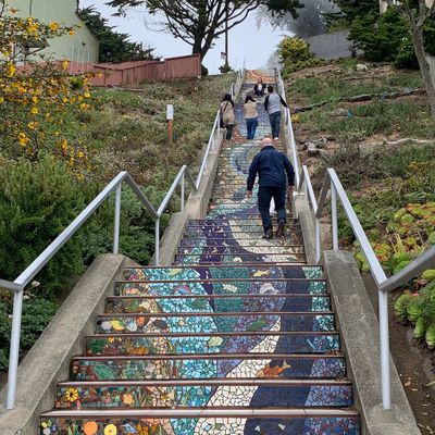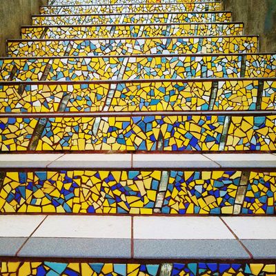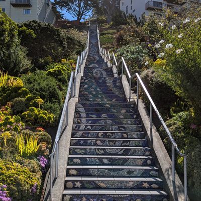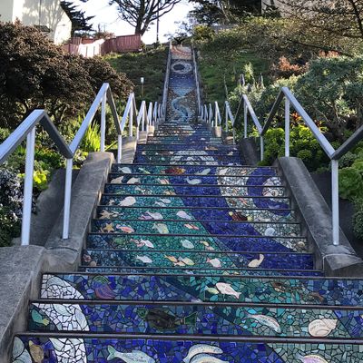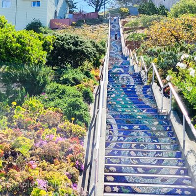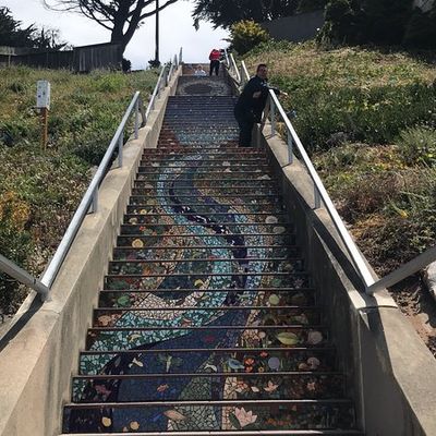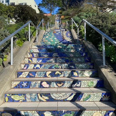 Public art installation featuring a 163-step stairway adorned with intricate mosaic tiles. This neighborhood collaboration showcases a sea-to-stars theme with vibrant details and surrounding gardens.