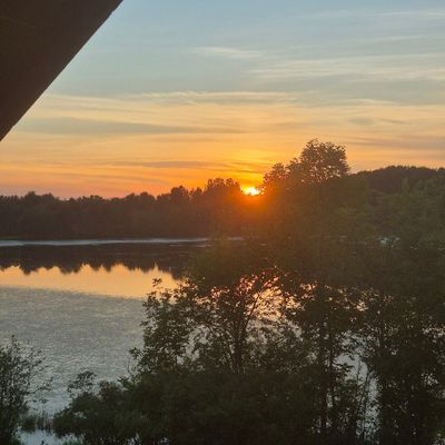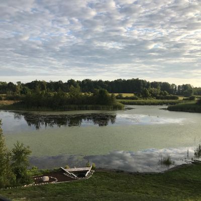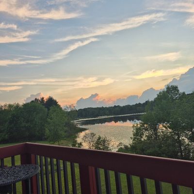 Secluded log cabin retreat set on a small lake. It offers a peaceful atmosphere with abundant wildlife, including deer.