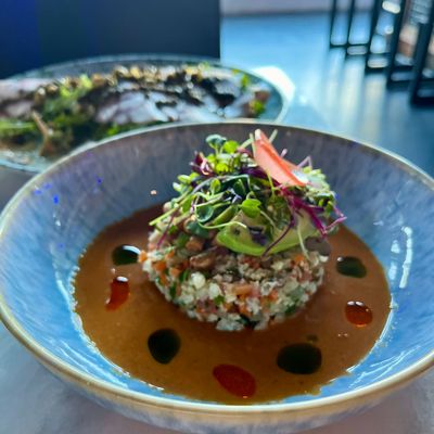 Modern upscale restaurant with a global menu featuring inventive cocktails and dishes like red ceviche, lamb, and wood-fired redfish, showcasing bold flavors.