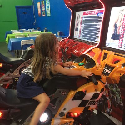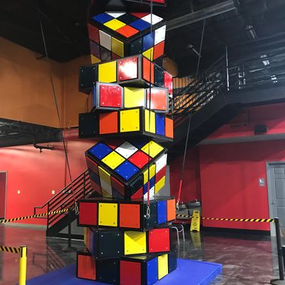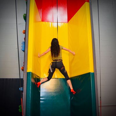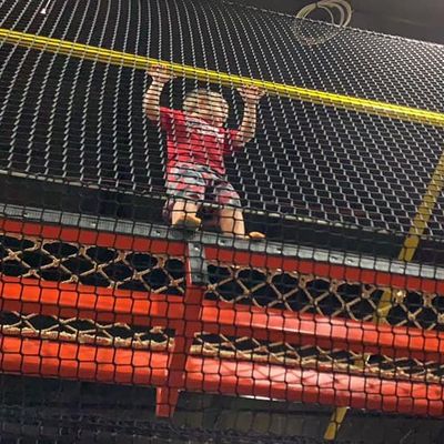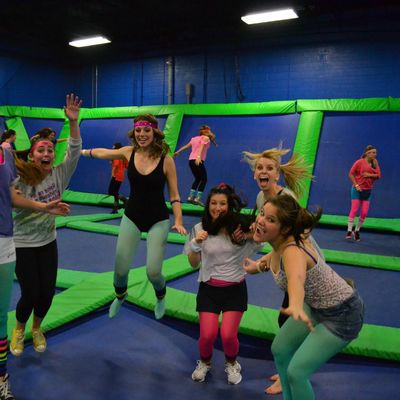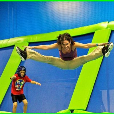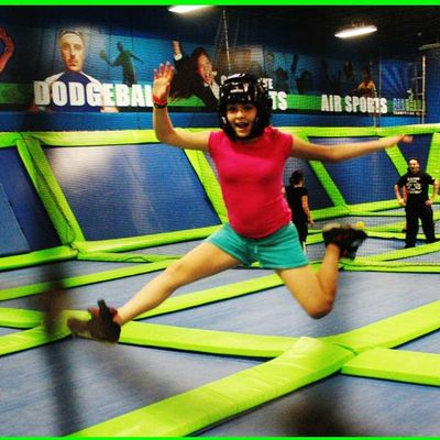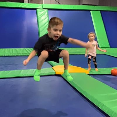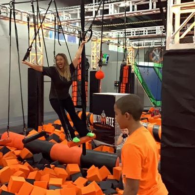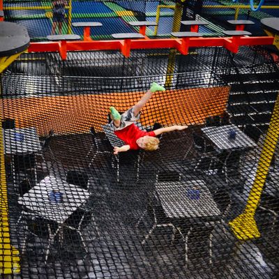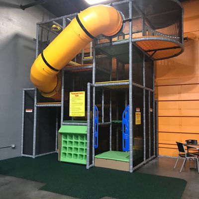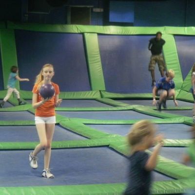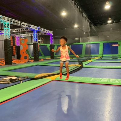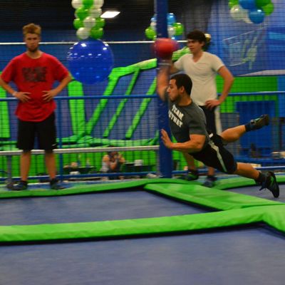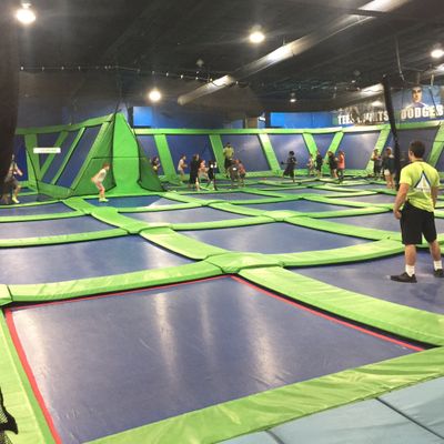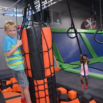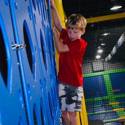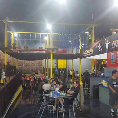 Indoor entertainment venue featuring trampolines, a ninja course, and an extreme climbing section. The updated facility offers areas for stunting and dodgeball, along with an arcade and food options.