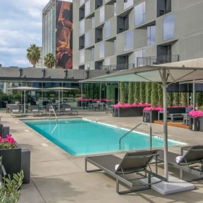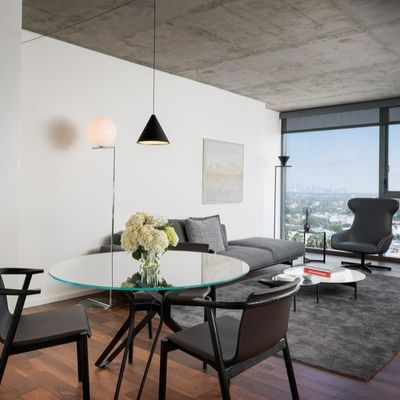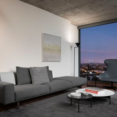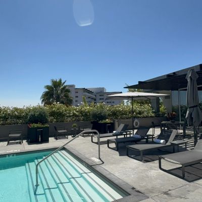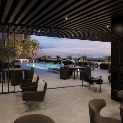 The atmosphere is sophisticated and residential, centered around high-end amenities like a private screening room and an outdoor swimming pool. Large windows provide expansive views, creating an airy, modern feel throughout the property.ambiance_potoo