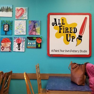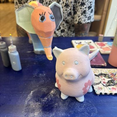 Pottery painting studio offering a variety of ceramic pieces for customers to decorate. The studio provides paints, stencils, and brushes, with options for both pottery painting and fused glass projects.