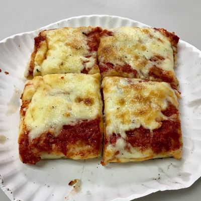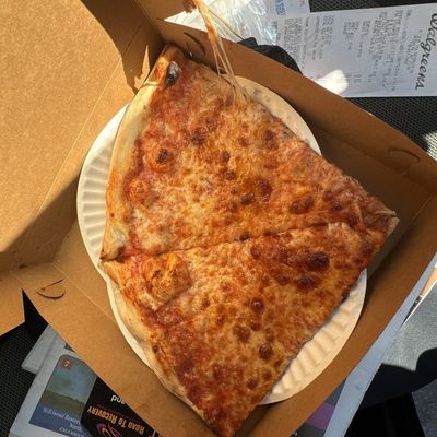 The menu features fresh, doughy cheese slices and a variety of Italian dishes. The dough has a notable texture that complements the classic toppings.food_potoo