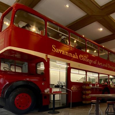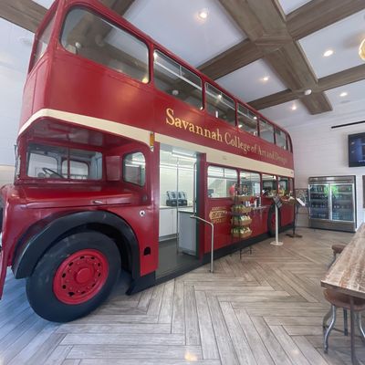 Cafe with a unique double-decker bus interior, offering coffee, smoothies, sandwiches, and light fare in a casual setting.