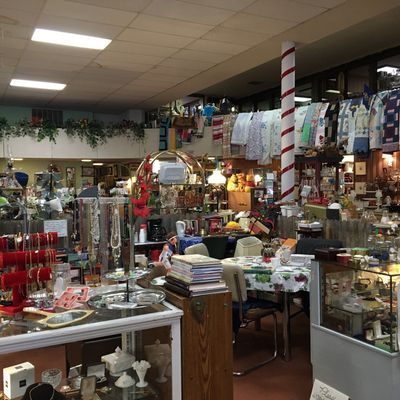 Sprawling antique mall housed within a historic former bank building. Spanning three levels, the space invites visitors to explore numerous rooms and booths filled with a diverse array of vintage items and collectibles.