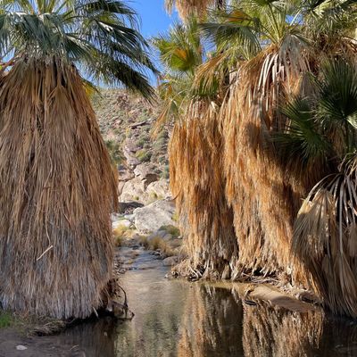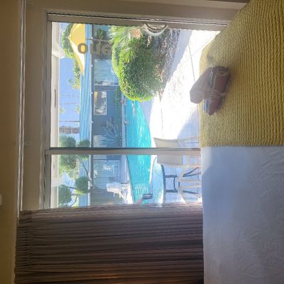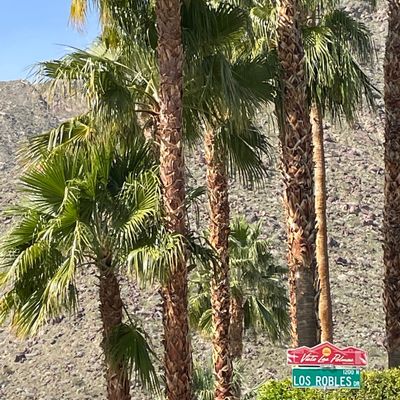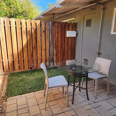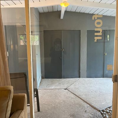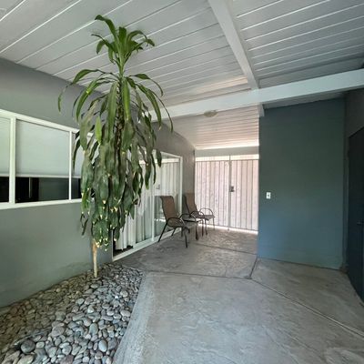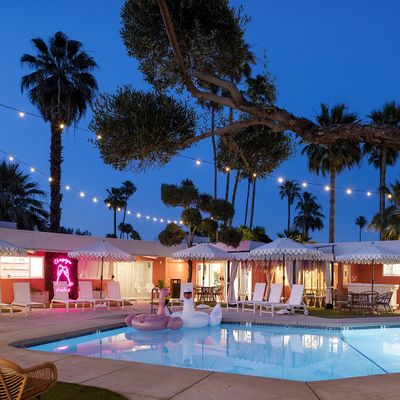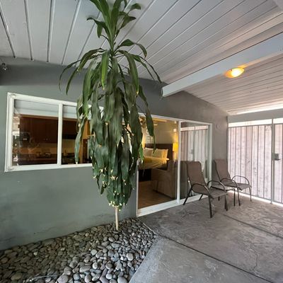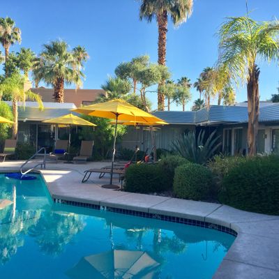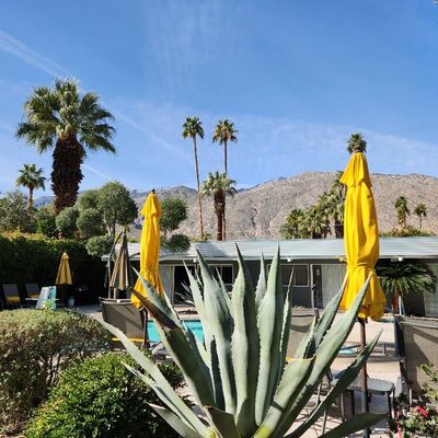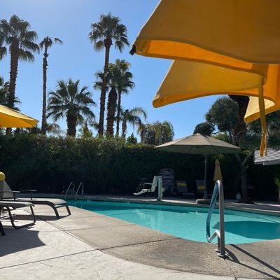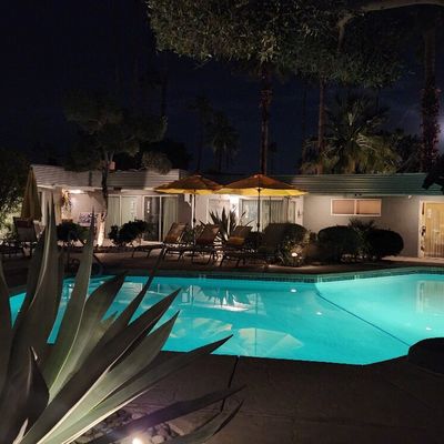 The atmosphere is a dreamy, desert oasis centered around a courtyard with a refreshing pool, a pergola with swings, and an outdoor fireplace for stargazing. It feels like a quaint, renovated vintage motel with a cutesy, romantic aesthetic perfect for a quiet retreat.ambiance_potoo