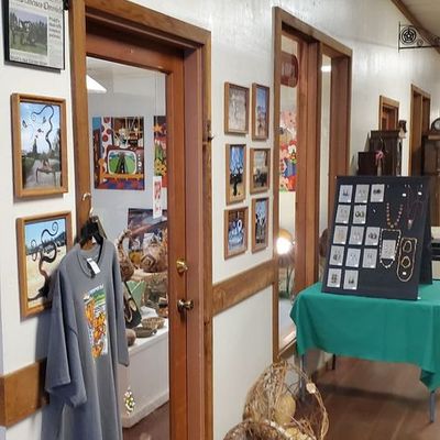 Small gallery showcasing unique, handcrafted art. The collection features intricate baskets, jewelry, and other artistic creations by the Harris family.