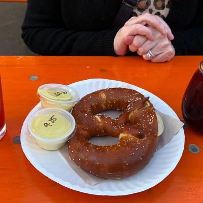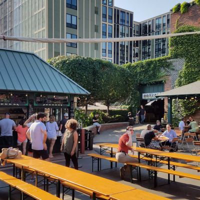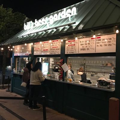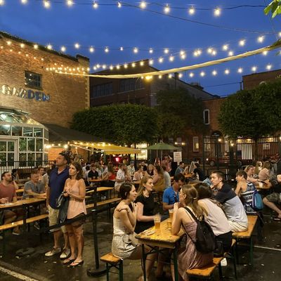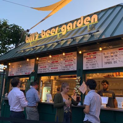 Seasonal outdoor beer garden with a lively atmosphere, offering a wide selection of craft beers, cocktails, and snacks; BYOF is allowed.