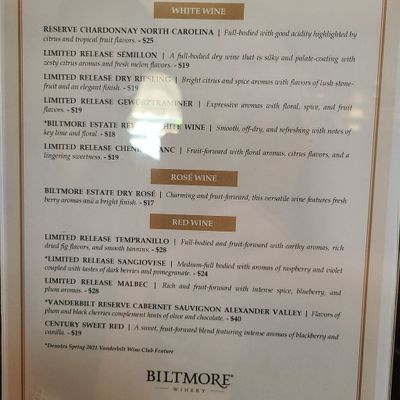 Biltmore Winery offers a complimentary wine tasting experience as part of the Biltmore Estate visit. Guests can select five different wines from a curated list, featuring a range of whites, reds, and rosés.