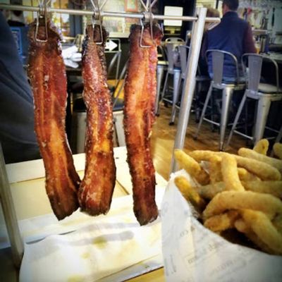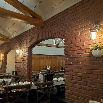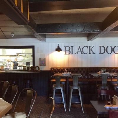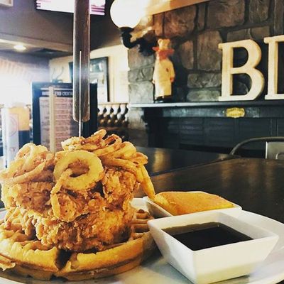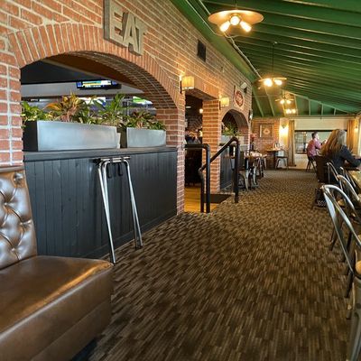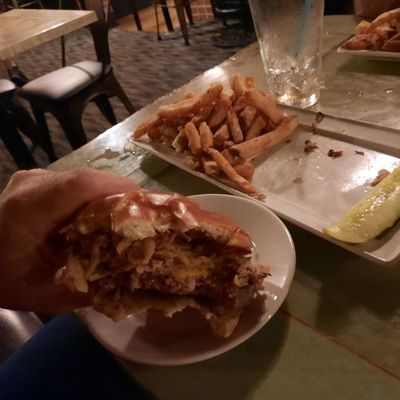 Casual American and barbecue restaurant with a full bar, offering varied seating and a large menu including burgers, pizzas, and smoked meats.