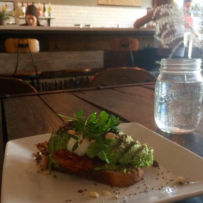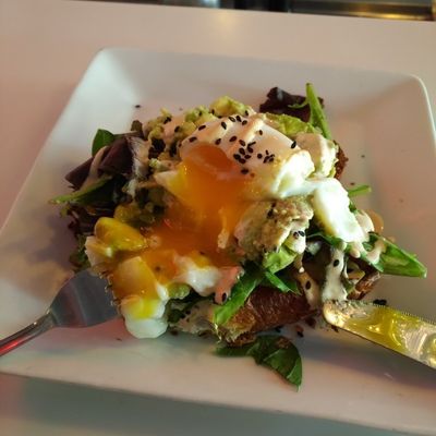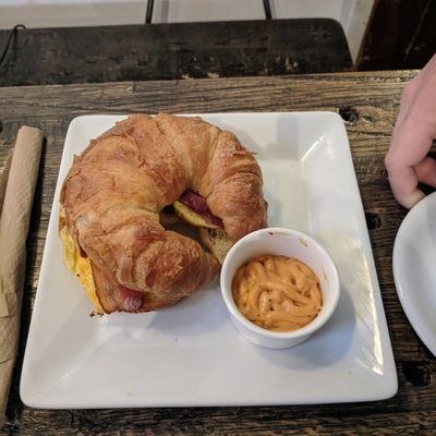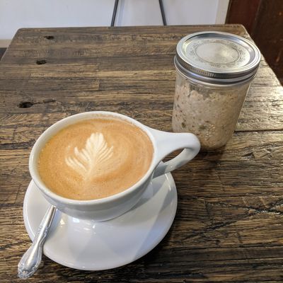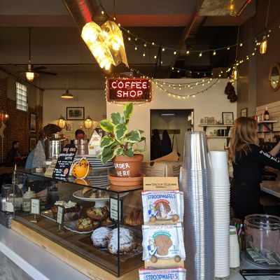 Neighborhood cafe offering coffee, brunch, and pastries with a hip, warehouse-like atmosphere featuring long tables and comfy seating.