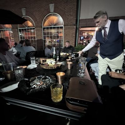 Sophisticated establishment offering a premium experience for cigar enthusiasts. It features a well-stocked humidor with a variety of cigars and an extensive selection of spirits, including bourbon and premium whiskies.