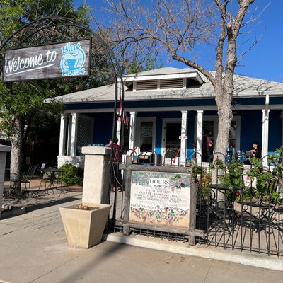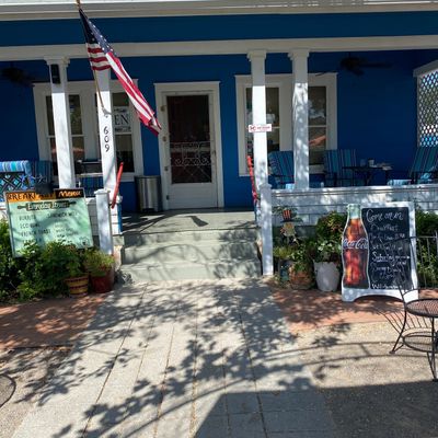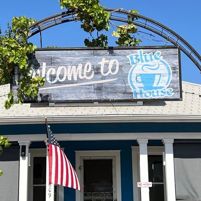 The cafe is easily recognized by its signature blue house exterior and features a resident cat named Gravy who is a frequent sight for visitors.story_potoo