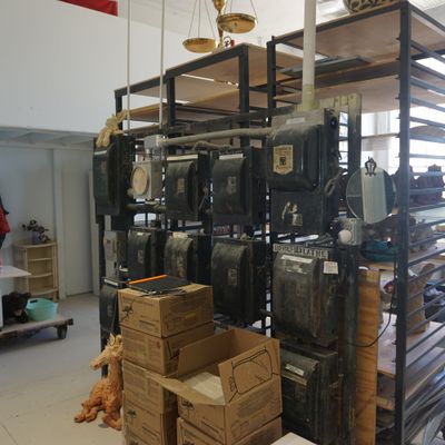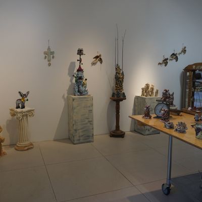 Pottery studio showcasing the handmade creations of artist Janie Layers. The studio features a diverse collection of animal sculptures, from small, personality-filled pieces to larger, striking figures.