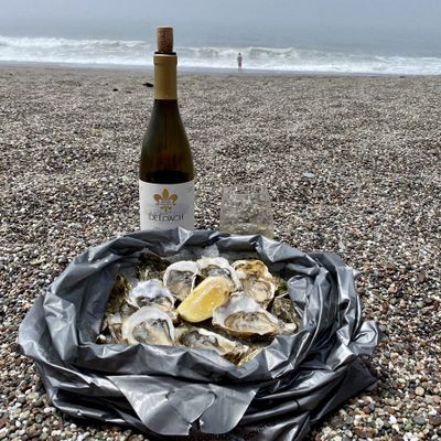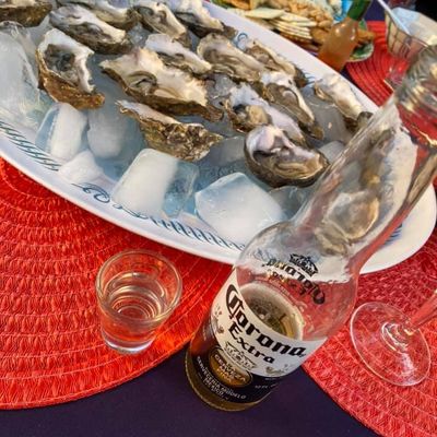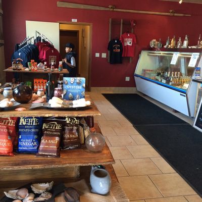 Roadside seafood market and oyster bar offering fresh oysters, BBQ oysters, and other seafood to go or for picnic-style dining.