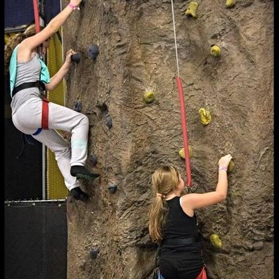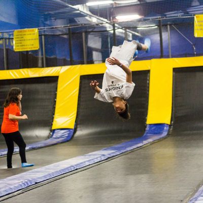 Indoor entertainment venue featuring a variety of trampoline-based activities. Visitors can enjoy large trampoline areas, a dodgeball arena, a rock climbing wall, and an arcade.