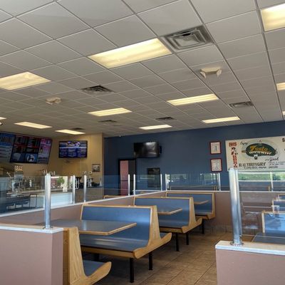 Fast-food chain offering burgers, hot dogs, fries, and an extensive ice cream menu with unique flavors like strawberry rhubarb, in a family-friendly atmosphere.