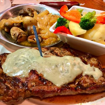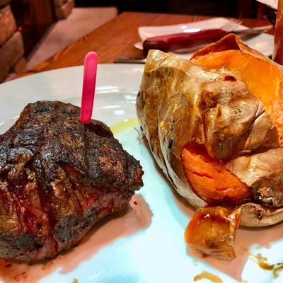 Reasonably priced steakhouse and bar restaurant in a shopping plaza, offering American cuisine with mixed reviews on service.