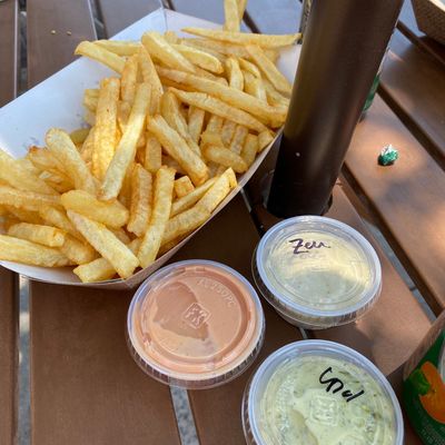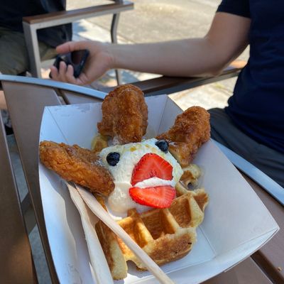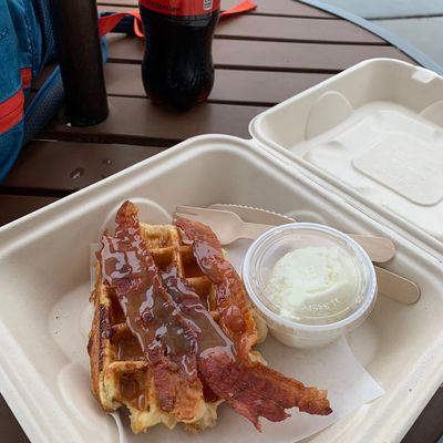 Casual airport eatery known for its Liège waffles, Belgian frites, and creative sandwiches, offering both sweet and savory options with outdoor seating.