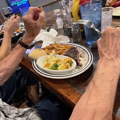 Classic small-town steakhouse and bar with a cozy atmosphere, featuring broasted chicken, burgers, and prime rib, plus a salad bar and outdoor beer garden.