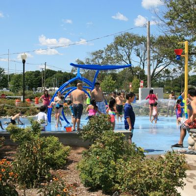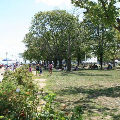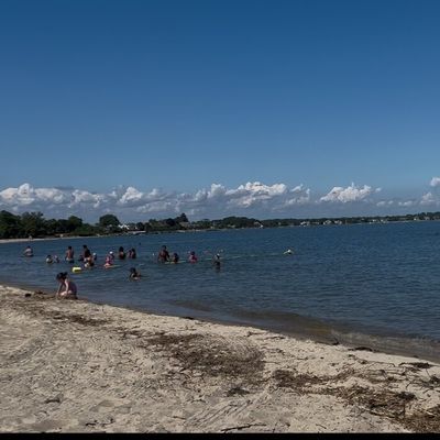 Public recreational area offering a mix of sandy shores and grassy spaces. It features amenities such as restrooms, a playground, and walking paths, with views of islands and marinas.