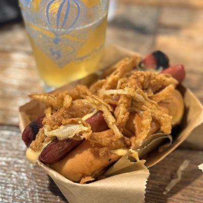 Casual beer garden with inconsistent food quality, featuring German sausages and burgers but experiencing issues with service and stock.