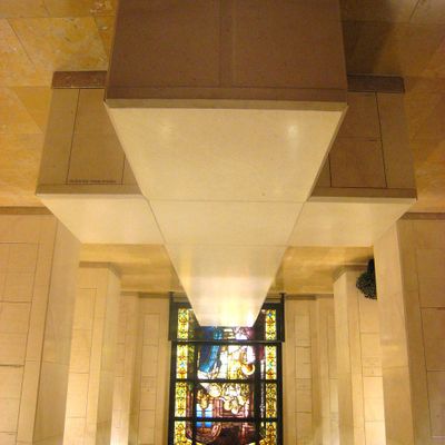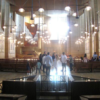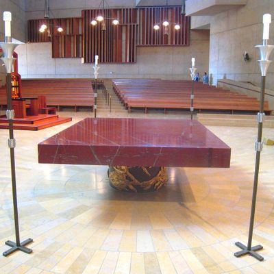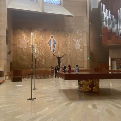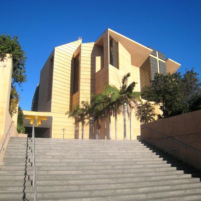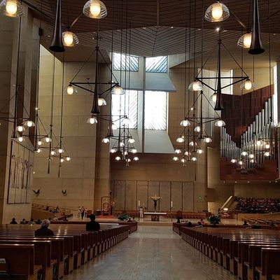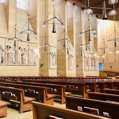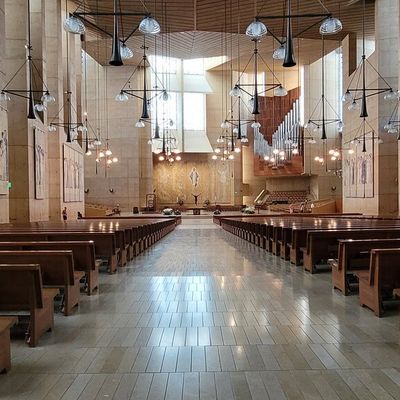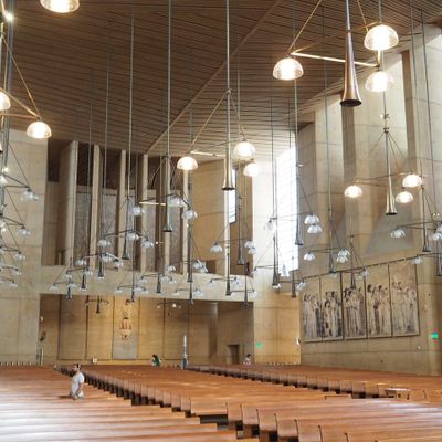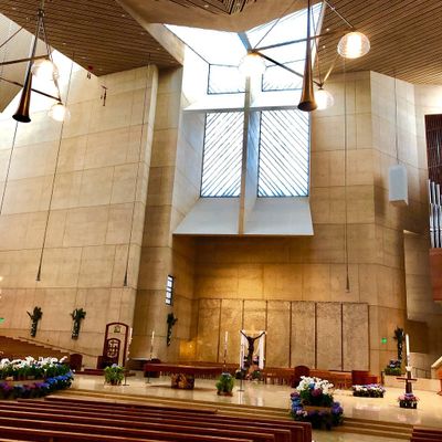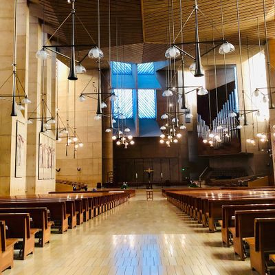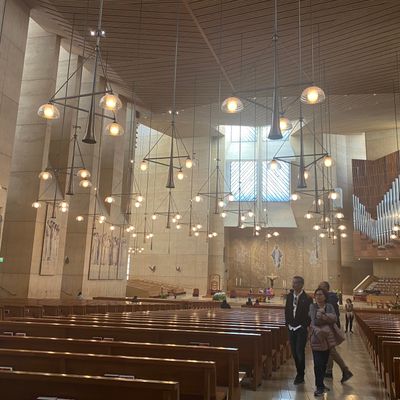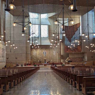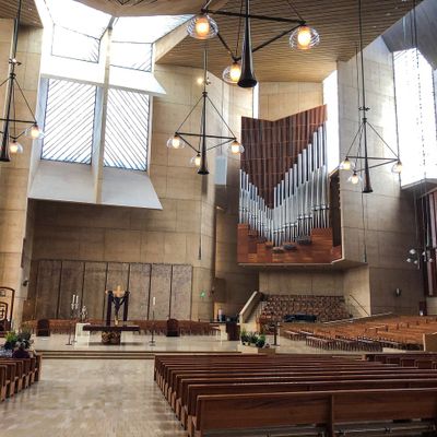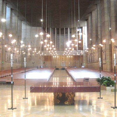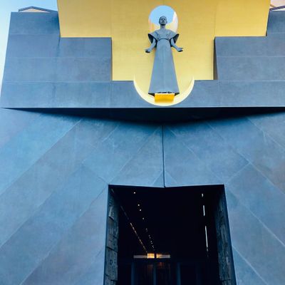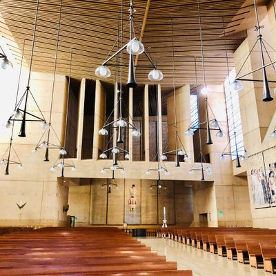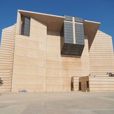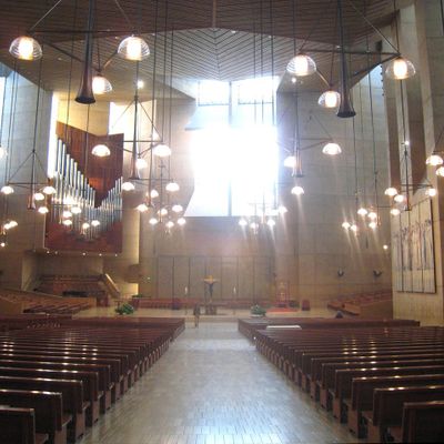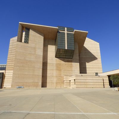 Modernist architectural masterpiece, completed in 2002. It features a striking postmodern design with expansive grounds, alabaster windows, and a blend of traditional and contemporary sacred art.