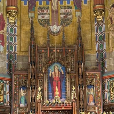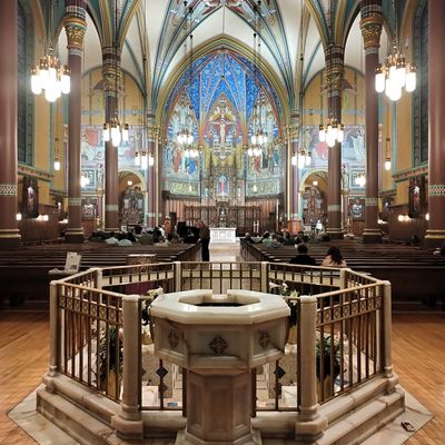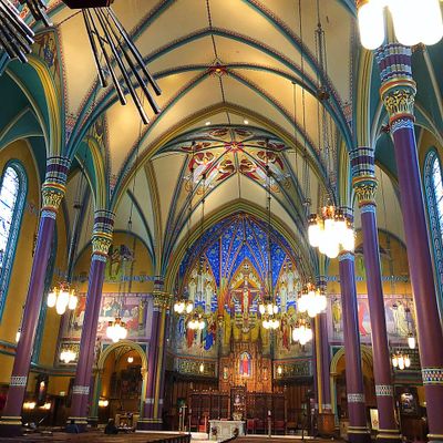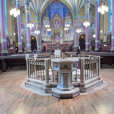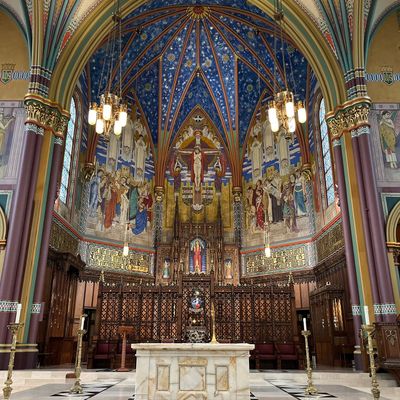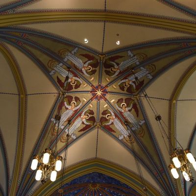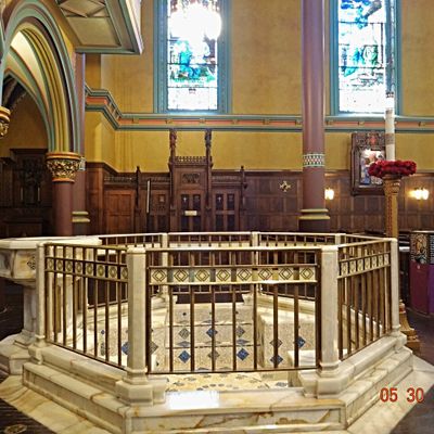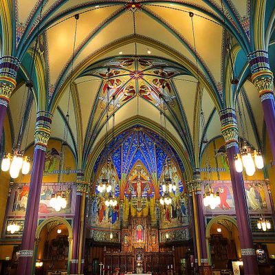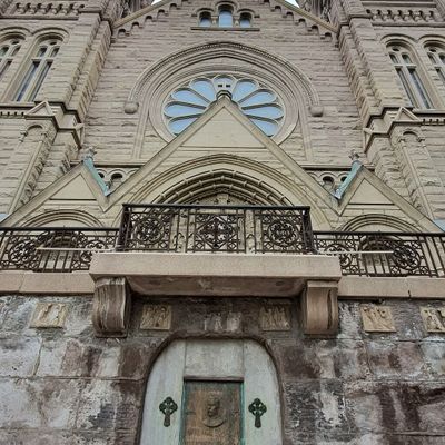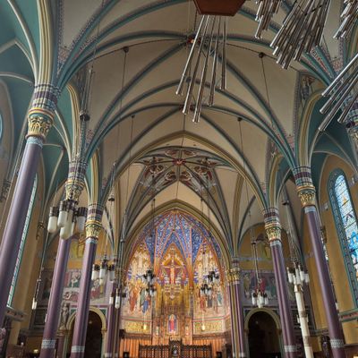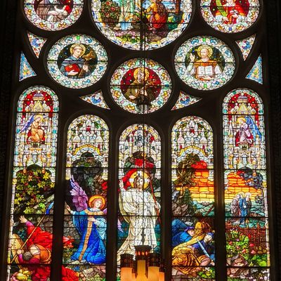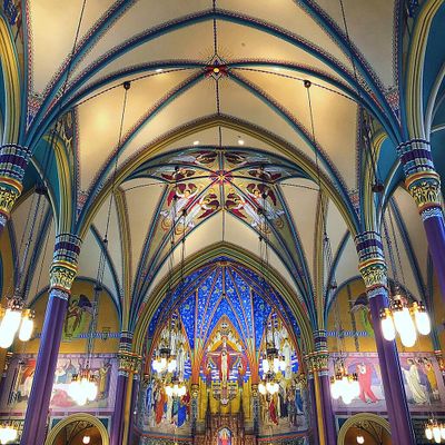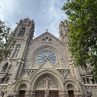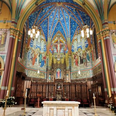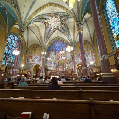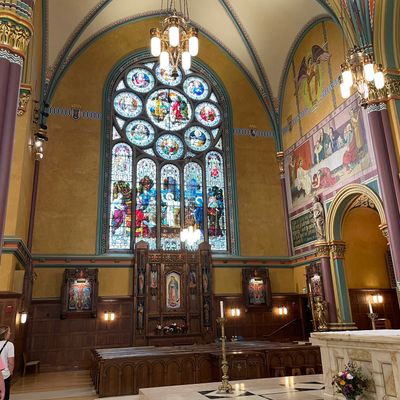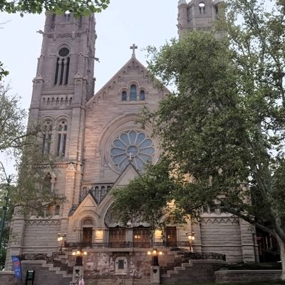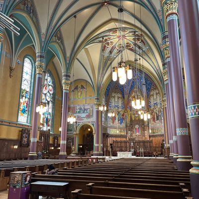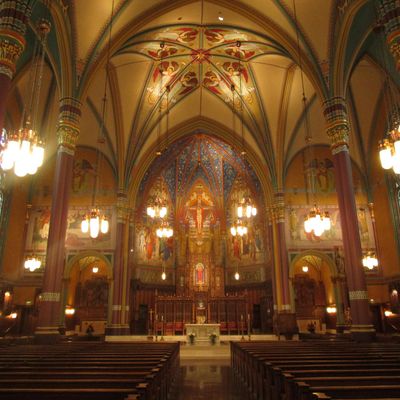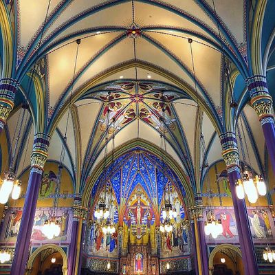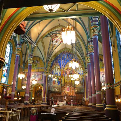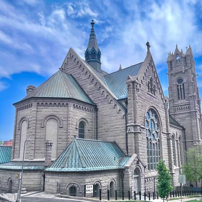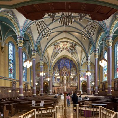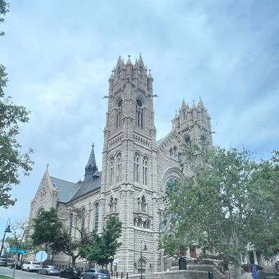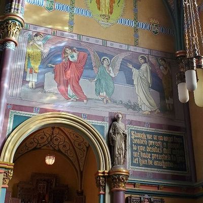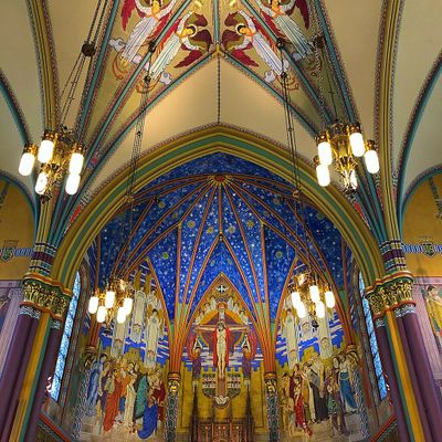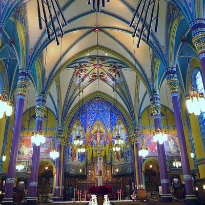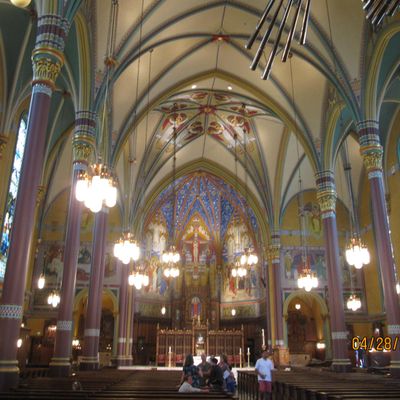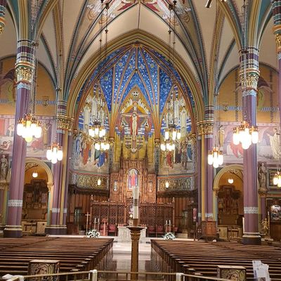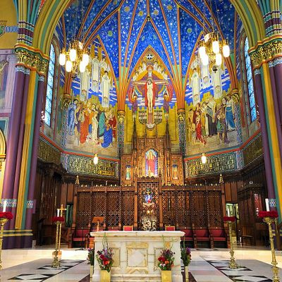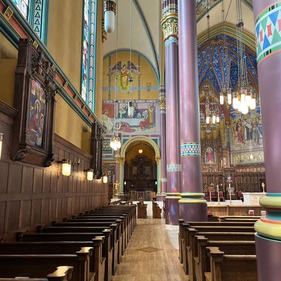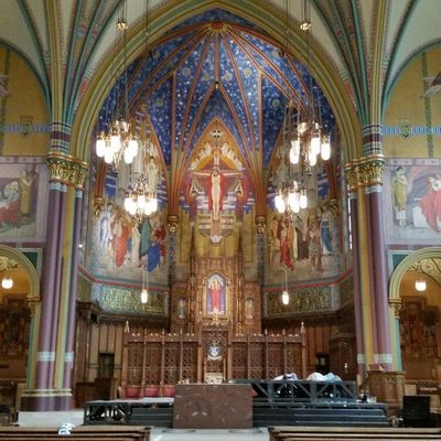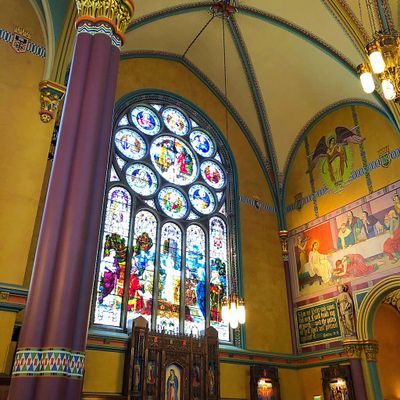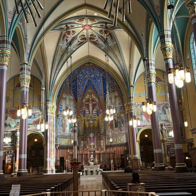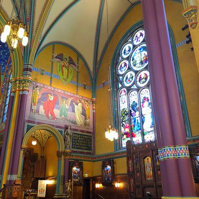 Historic Roman Catholic cathedral dating back to 1909. It features a striking neo-Romanesque exterior and a Gothic interior adorned with colorful murals, brilliant stained glass windows, ornate statues, and a significant baptismal font. long_description