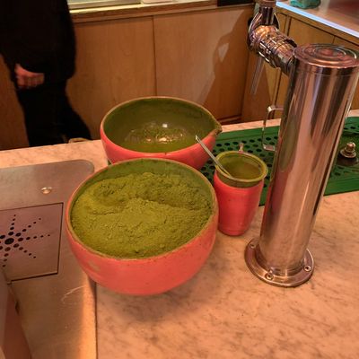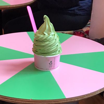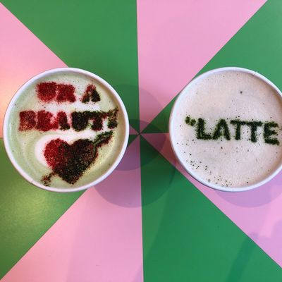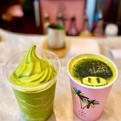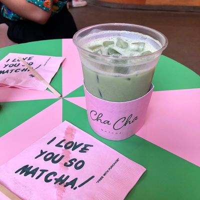 Trendy cafe known for its matcha drinks and other beverages, offering a cute and vibrant atmosphere with various seating options.