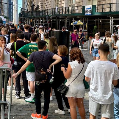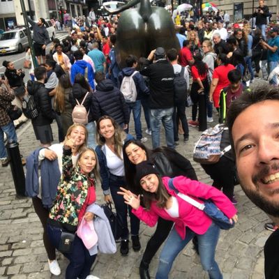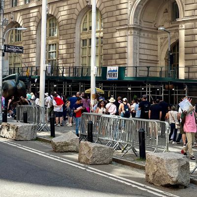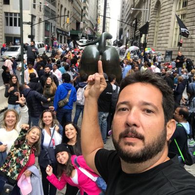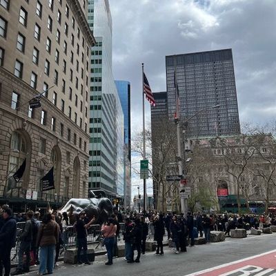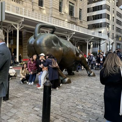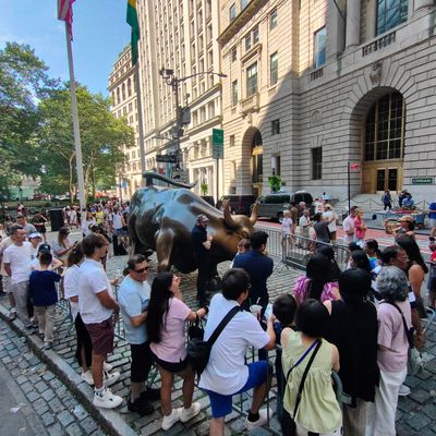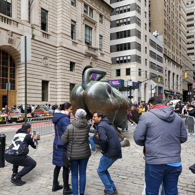 The area around the sculpture is high-energy and bustling, often crowded with people waiting for their turn to snap a photo. It feels like a central, high-traffic landmark where the city's financial energy is palpable.ambiance_potoo