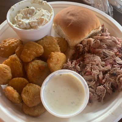Local barbecue joint offering smoked meats, generous portions, and popular sides like fried pickles and potato salad, with a friendly atmosphere.