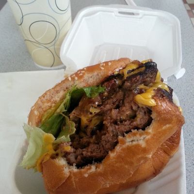 Fast-food spot known for its large, juicy burgers, generous portions of fries and coleslaw, and delicious milkshakes, offering a diner-like atmosphere.