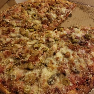 Family-owned takeout and delivery pizza place with a few tables, known for its delicious, generous pizzas and salads with fresh ingredients.