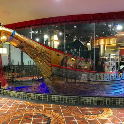 Classic Las Vegas lounge and bar with a long history at Caesars Palace. The intimate venue features a centerpiece floating barge, modeled after ancient Egyptian royalty transport, and is decorated in opulent reds and golds.