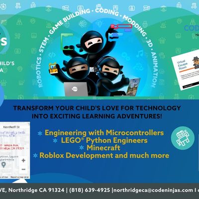 Join Code Ninjas for a 6-hour STEM camp featuring a range of interesting projects and activities like Microbits, Makecode Arcade, and 3D Design. Camp hours are from 8:30 AM to 2:30 PM.
