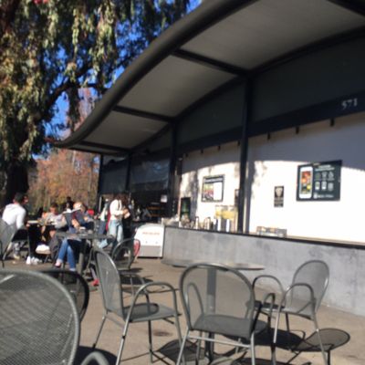 Stanford campus chain cafe offering American-style breakfast, lunch, and dinner options with outdoor seating, known for its coffee and pastries but with inconsistent food quality and service.