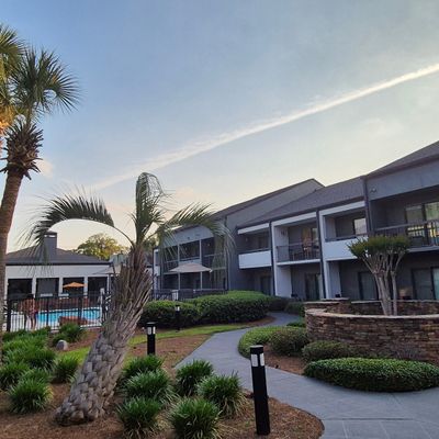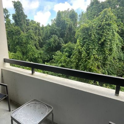 The lobby feels clean and modern, though the atmosphere can be affected by noise from a nearby sports bar across the street. The environment is functional, centered around a 24/7 fitness center and an outdoor pool area.ambiance_potoo