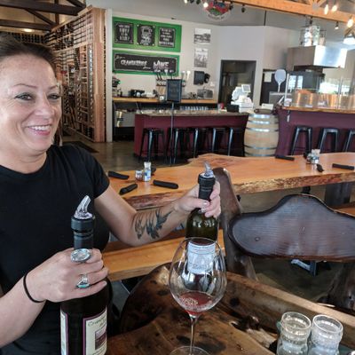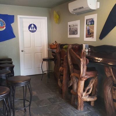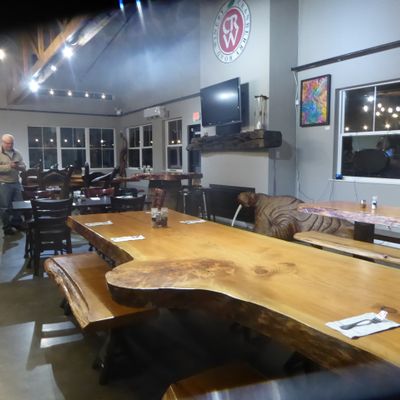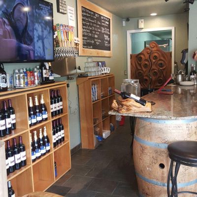 Unique establishment that offers both wine and craft beer. The venue features a visually striking post-and-beam structure with hand-hewn slab tables, creating a distinctive atmosphere.