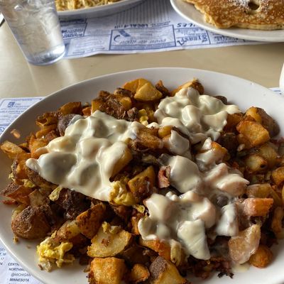 Quaint, American diner with large portions and a retro atmosphere, offering breakfast, lunch, and dinner with a sometimes long wait.
