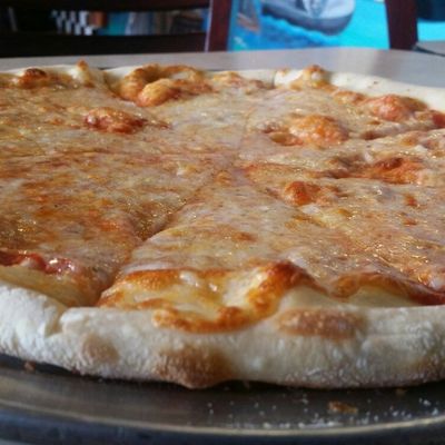 Casual pizzeria offering delicious NY-style pizza, with some pasta options, and outdoor seating overlooking a pond.