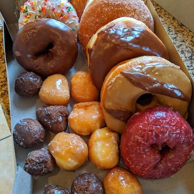 Casual donut shop with a good selection of fresh donuts, bagels, and sandwiches, offering friendly service and decent prices in a convenient location.