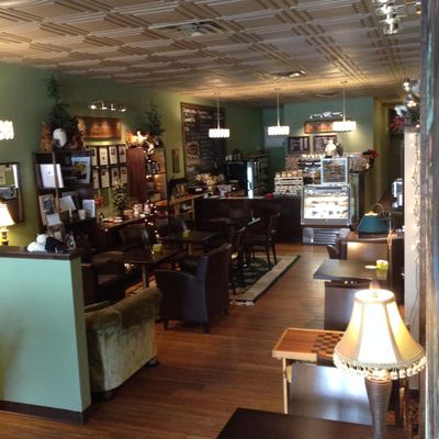 Local cafe offering organic coffee, loose leaf teas, and pastries in a relaxed, cozy atmosphere with ample seating.