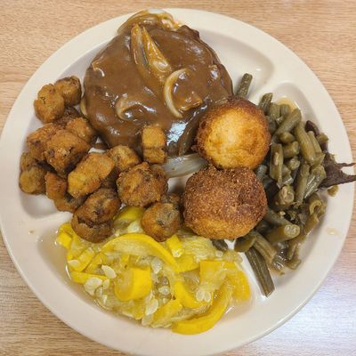 Rural restaurant offering Southern-style home cooking, including meat-and-three options, steaks, and seafood, with a cafeteria-style lunch and table service for dinner.