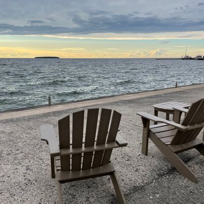 Charming hotel offering a prime location directly across from the bay. Guests can enjoy beautiful water views, especially during sunset, and access to a private beach area with seating.