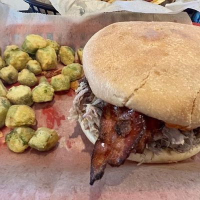 Barbecue and American pub with a sports bar atmosphere, offering a varied menu including burgers, pork dishes, and sides like Brunswick stew and onion rings.