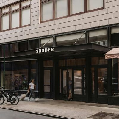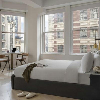 Hotel offering a unique self-check-in experience. It features spacious rooms with large windows providing city views and comfortable bedding.